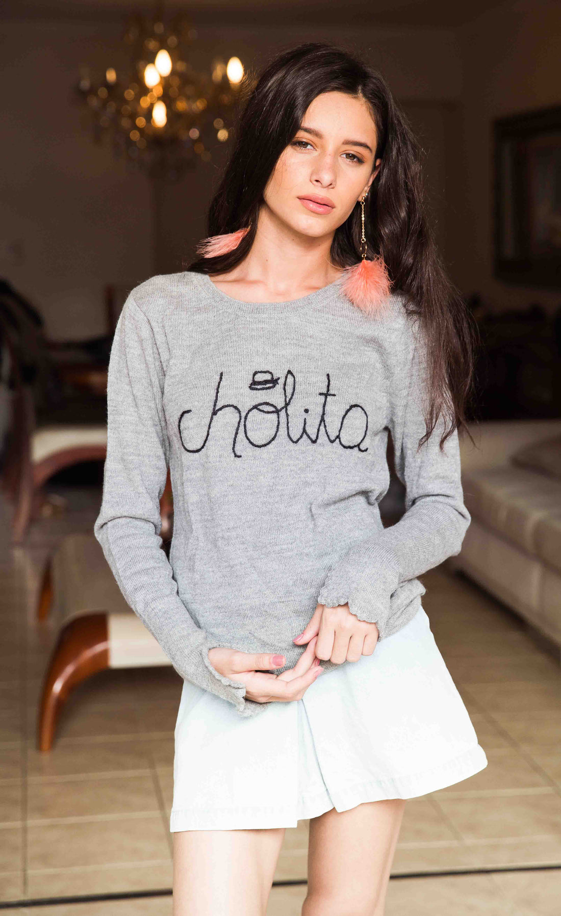 Light baby alpaca sweaters hand embroidered by Bolivian artisans that feature our YAPA signature crochet embroidered handcuffs.