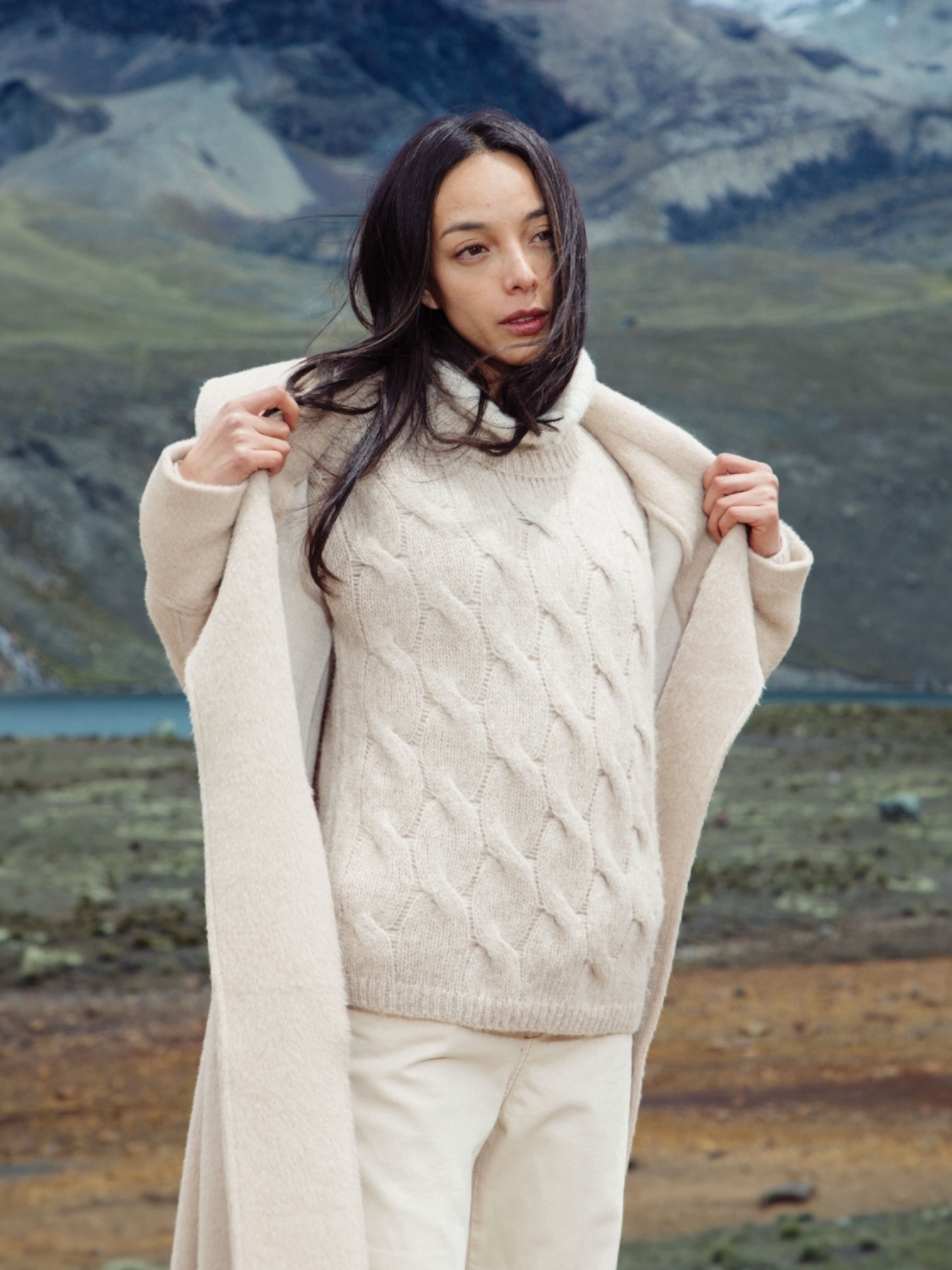 Deléitese con la acogedora elegancia del suéter de punto trenzado KARAMEL , confeccionado a mano con una suave mezcla de lana de llama bebé. Este suéter combina la suavidad y calidez de la lana de llama bebé con un toque de sofisticación moderna, creando una prenda elegante y cómoda. Su clásico diseño de punto trenzado le aporta textura y profundidad, convirtiéndolo en una prenda versátil para cualquier armario.