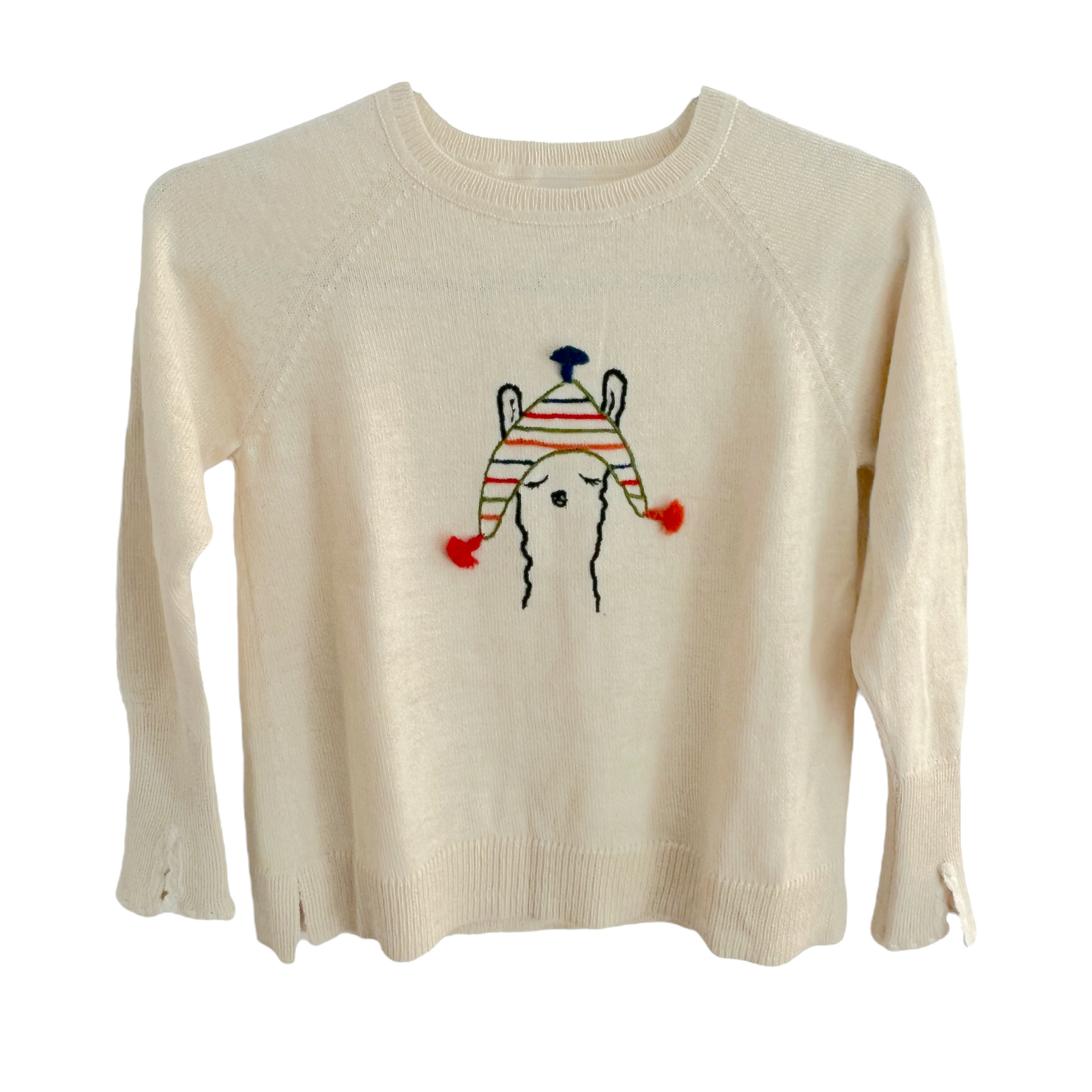 Suéter de punto ligero, hecho 100% en lana de alpaca bebé, decorado con una alpaca bordada a mano y un gorro típico andino. Este suéter único y divertido es ideal para cualquier temporada. Consigue el look perfecto y combínalo con nuestros mitones Kids Star .