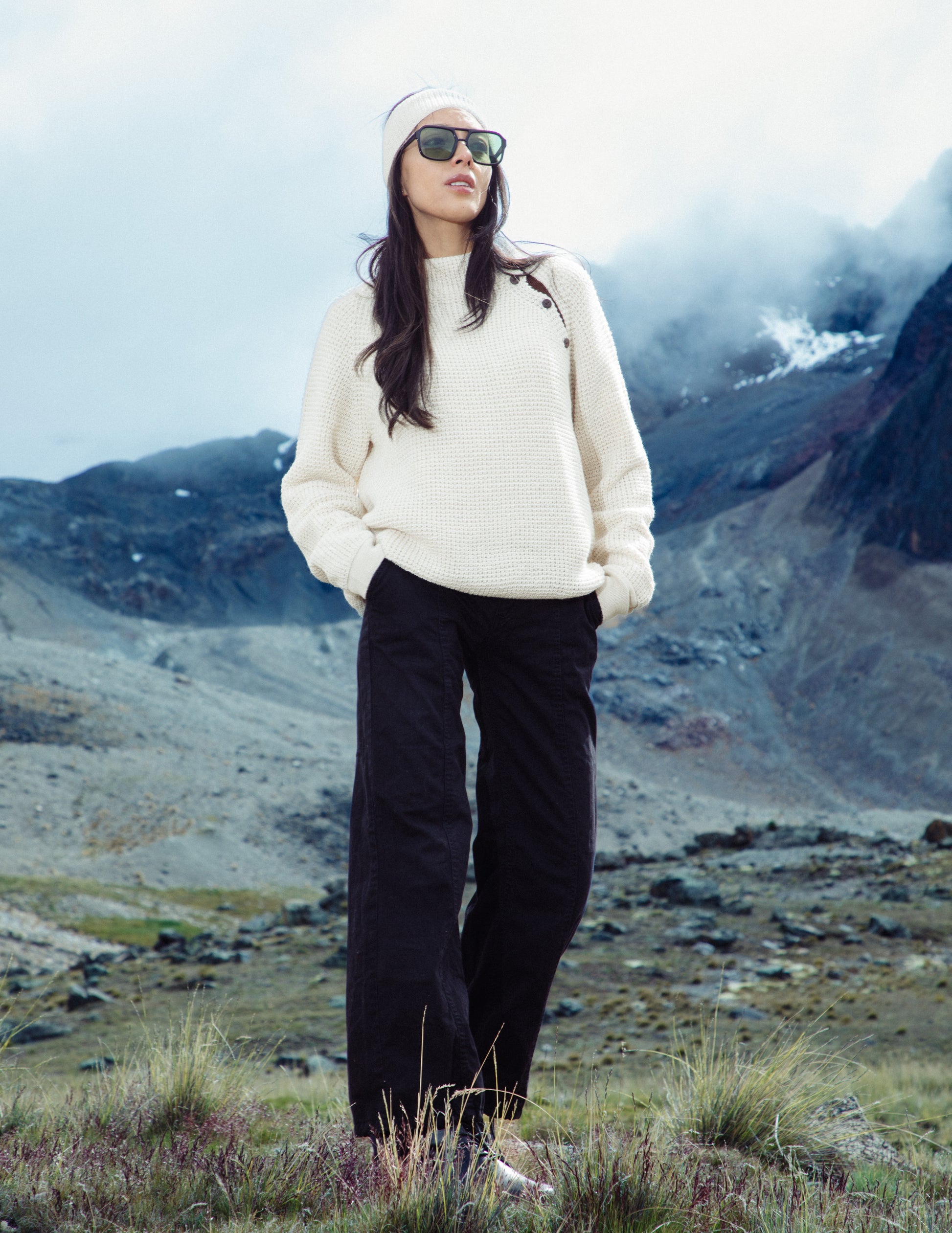 70% lana de llama bebé 30% polamida reciclada.Los suéteres YAPA están diseñados en Nueva York y elaborados éticamente por artesanos en Bolivia.