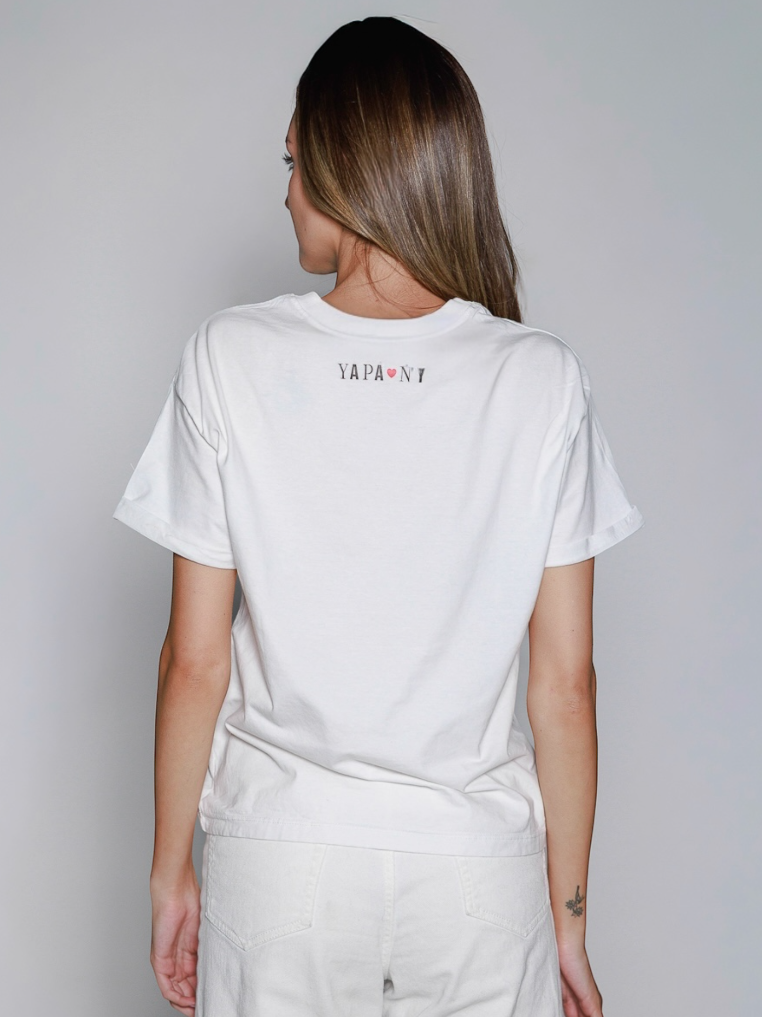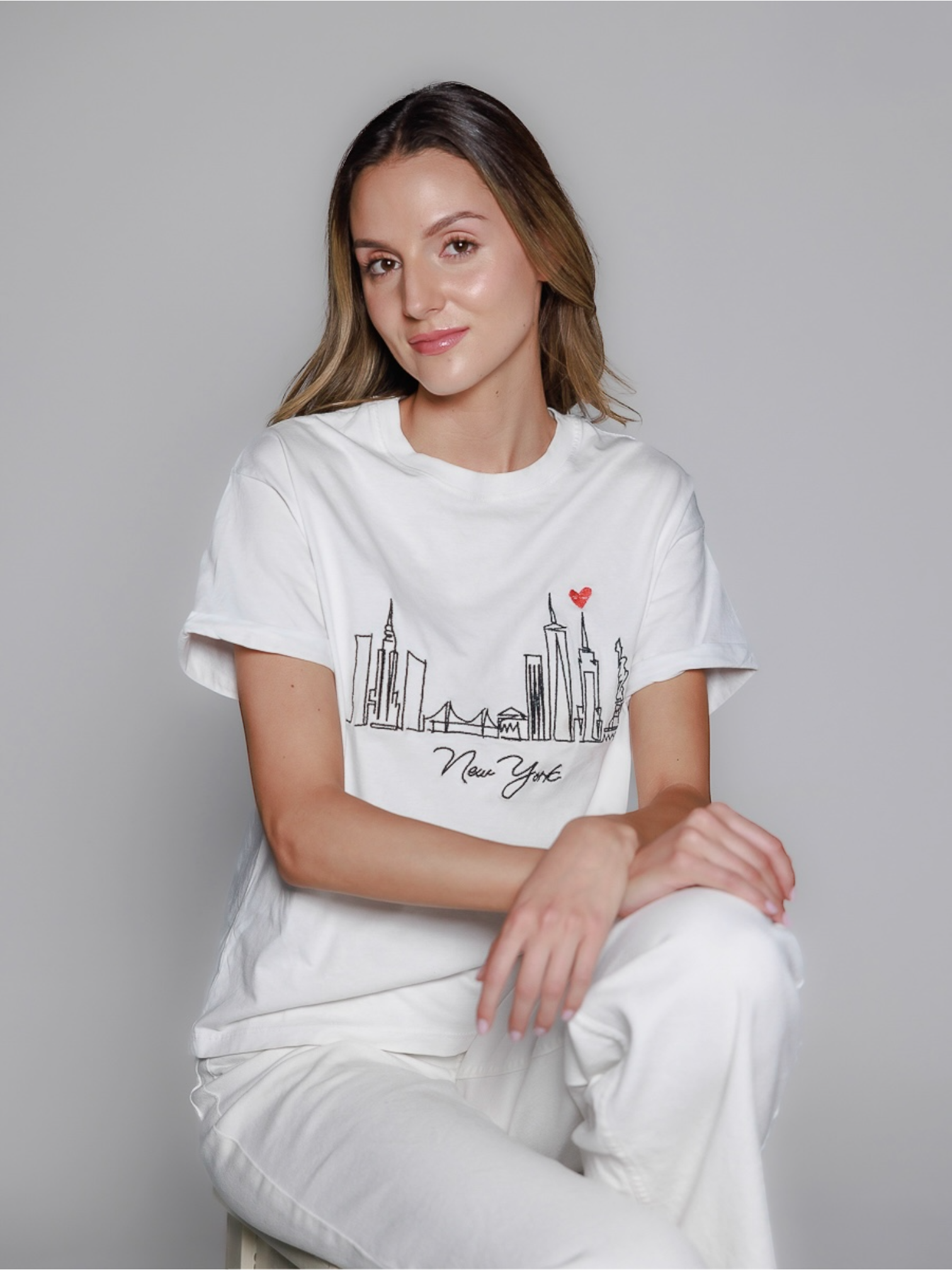 Woman wearing a white t-shirt with a New York skyline design on a plain background