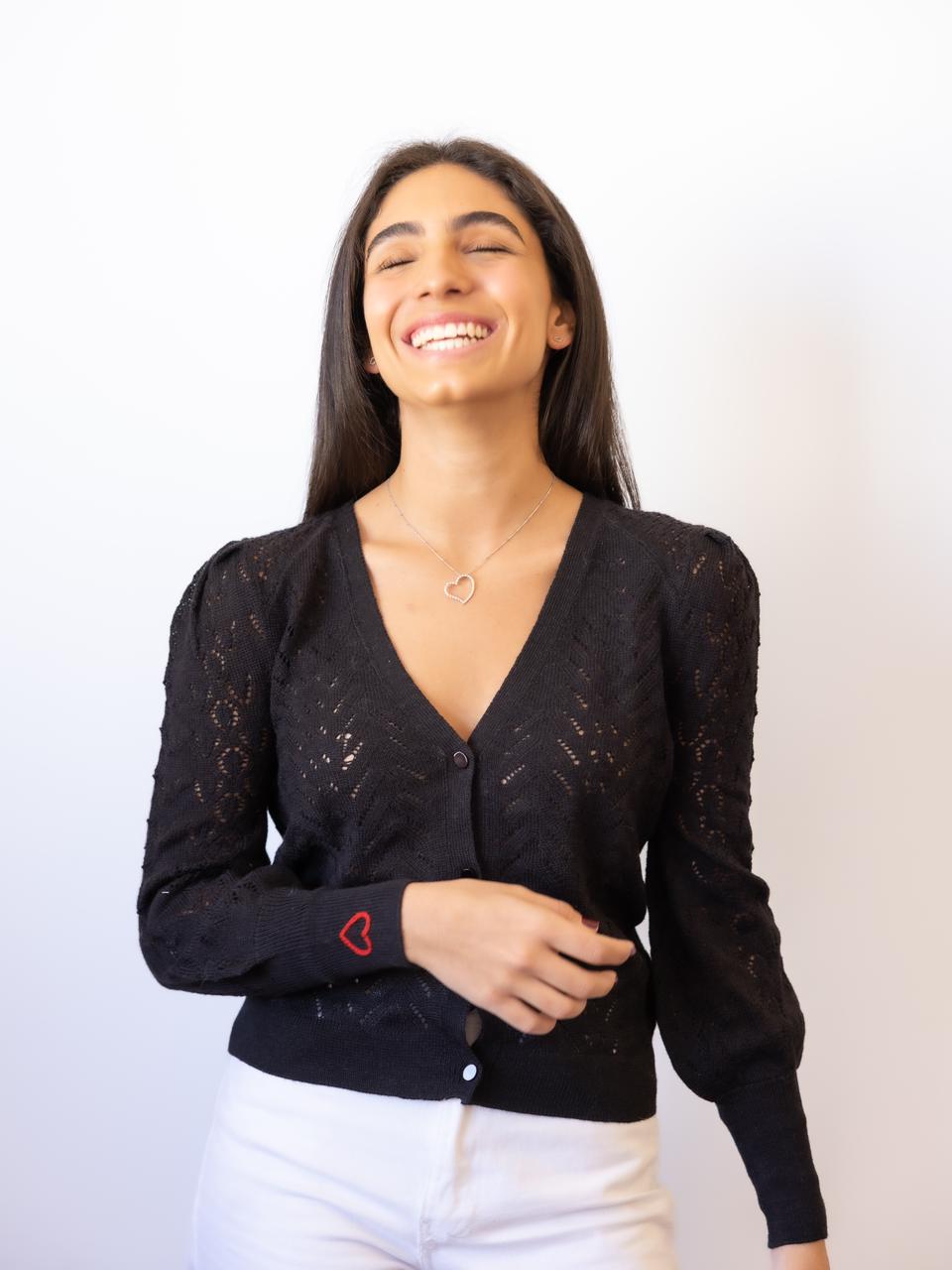 Baby alpaca light cardigan with patterned knit and buttons. Adorned with a hand embroidered heart in one sleeve.