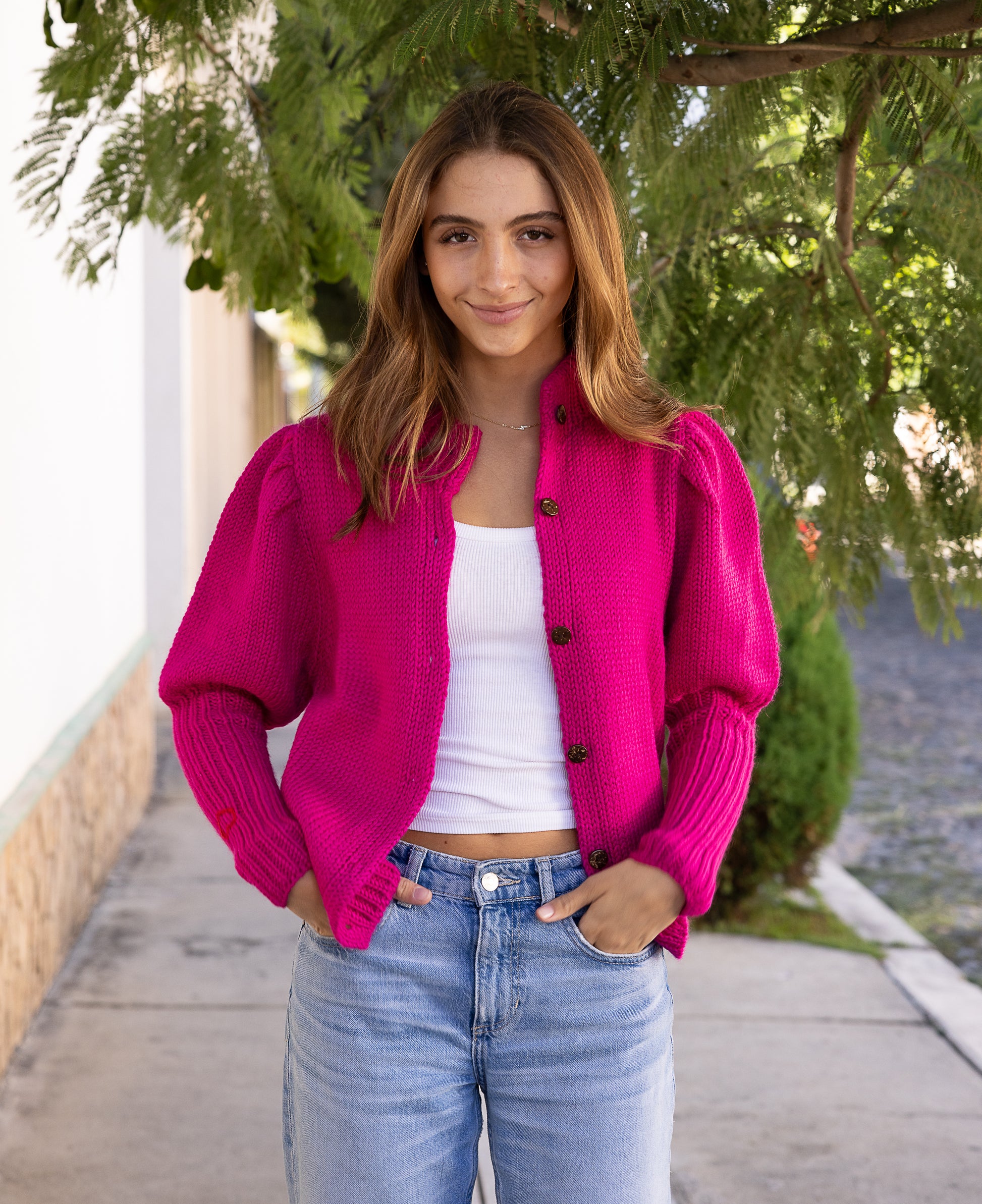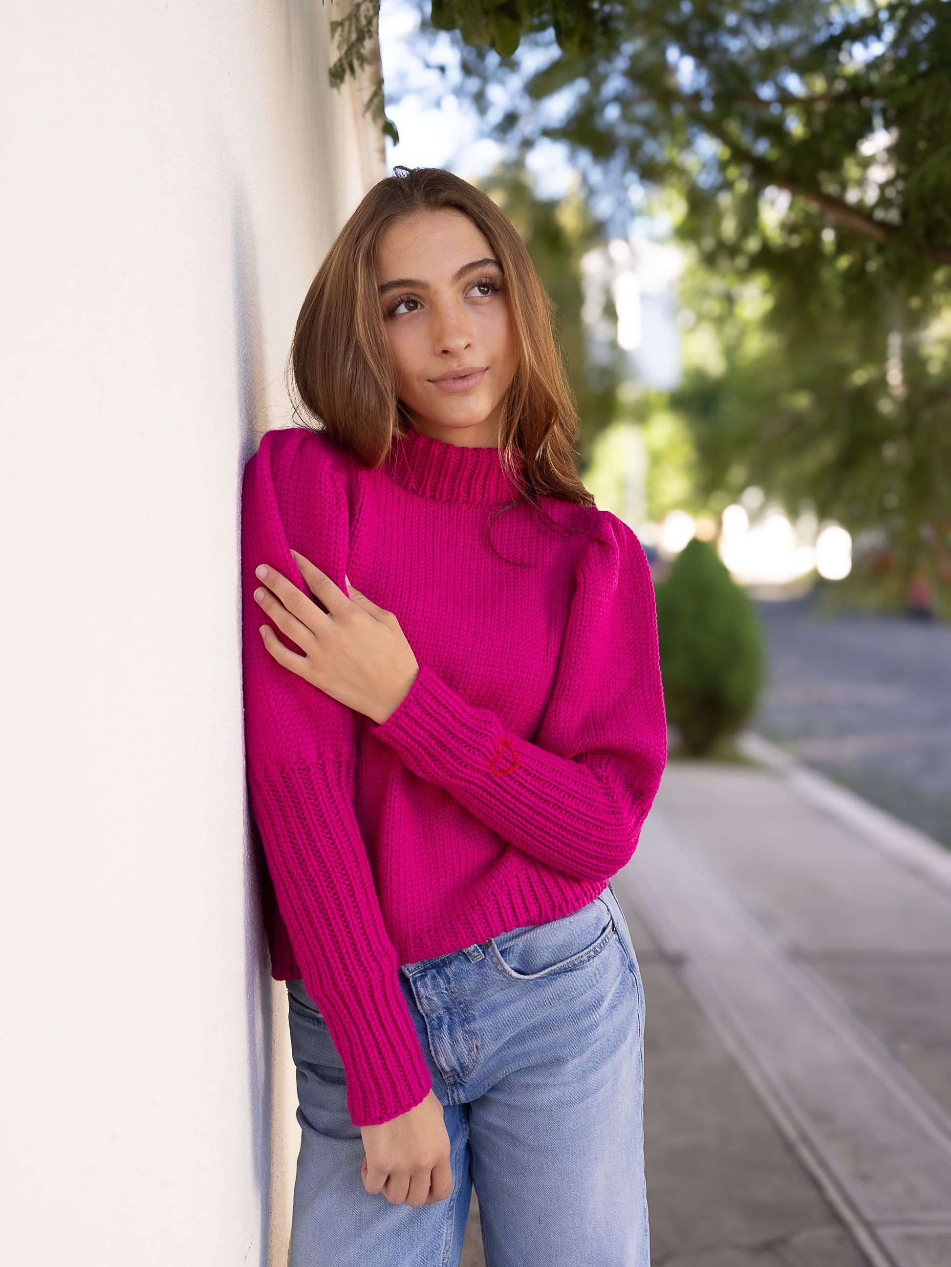 Our Chunky Diana Sweater with princess sleeves offers the perfect blend of style and comfort. Made from cozy 100% baby alpaca wool, this reversible piece can be worn as a sweater or a cardigan to keep you fashionably warm. Adorned with a hand-embroidered heart, it pairs beautifully with our alpaca accessories for a charming, cozy look.